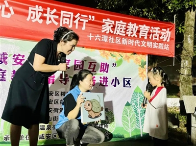 9月9日晚,咸安区十六潭社区新时代文明实践站在清馨苑小区开展家庭教育活动,旨在促进亲子间情感交流,促进儿童健康成长,培养儿童的创造力和责任感,共同构建幸福家庭。活动共计40余名儿童青少年与家长参与。