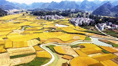 10月7日在广西靖西禄峒镇大院村拍摄的田园景色(无人机照片)。金秋时节,乡间农田与河流、群山、村落相互映衬,一步一景,美不胜收。 据新华社