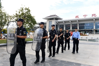 图①:10月1日,高铁咸宁北站广场前,咸安公安分局特巡警大队巡逻执勤。