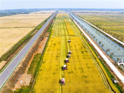 一望无际的稻田里,8台收割机正忙碌地穿梭着。10月9日,咸安区向阳湖现代农业科技示范园8200亩水稻田一片丰收的热闹景象。