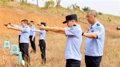 “枪弹结合,开始射击!”现场发令员下达口令后,参训民警严格遵照实弹射击的纪律和枪支操作流程规范操作,瞄准、击发、退匣、验枪、验靶……五人一组有序进行。