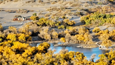 10月13日拍摄的内蒙古阿拉善盟额济纳旗大漠胡杨林景区(无人机照片)。
