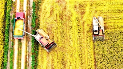 10月13日,通城县塘湖镇龙印村千亩稻田喜获丰收,种粮大户驾驶农业机械收割稻谷,忙着运输、抢晒,确保颗粒归仓。近年来,该县大力推进“藏粮于地”“藏粮于技”,通过土地流转,小田变大田,推进高标准农田建设,推广“粮食作物+”技术模式,以科技支撑提升粮食产能和效益,实现农业增效、农民增收。 刘建平摄(影像咸宁)