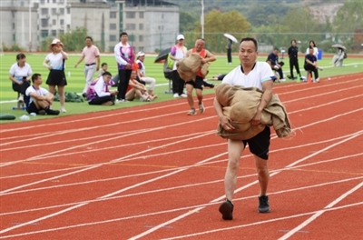 10月18日,市第三届运动会农民农趣田径比赛,选手们在进行搬运粮食比赛。
