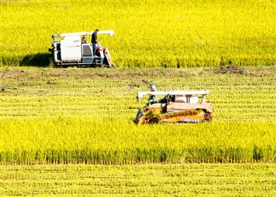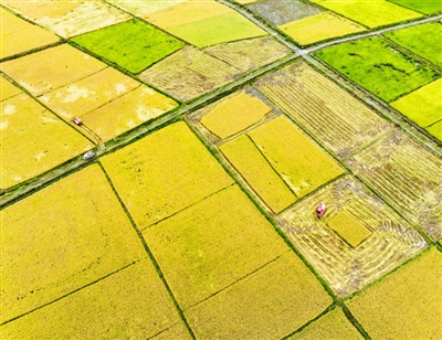 图①:10月20日,在湖南省永州市道县梅花镇棠下村,农民驾驶农机收割晚稻(无人机照片)。