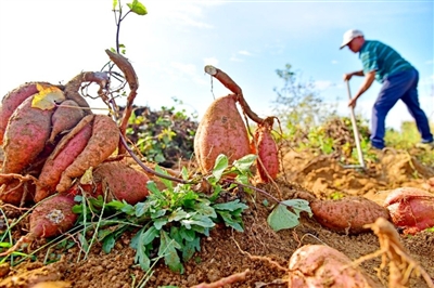 图④:10月20日,山东省枣庄市山亭区店子镇柳泉村农民在田间收获地瓜。