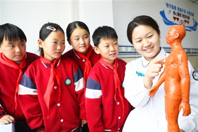 10月22日,在河北省唐山市丰润区中医医院,医务人员向泉河头镇东孝义小学学生介绍人体穴位知识。