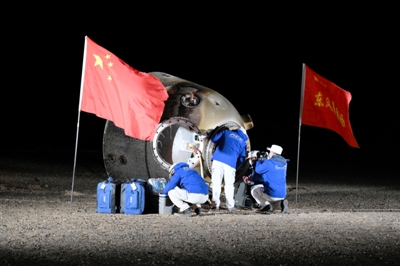 记者赶到着陆点看到,地面搜救队伍已到达现场架起灯光。灯光交汇处,工作人员正在返回舱附近有条不紊地开展工作。