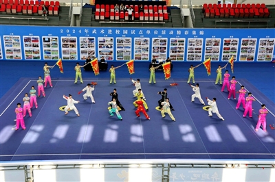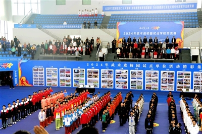 10月29日,2024年武术进校园试点学校交流赛在武汉东湖学院嘉鱼教学改革基地体育馆开幕,来自上海、湖北、重庆、河南、广东等地的15个试点单位近500名师生代表齐聚嘉鱼以武会友。