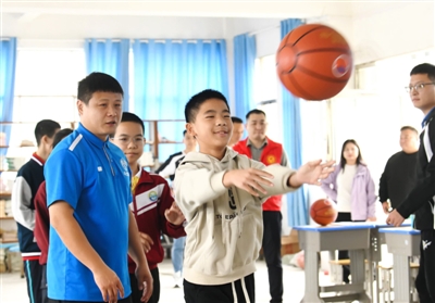 近日,咸安区大幕乡常收中学,斗士联盟的篮球教练耐心地为学生讲解篮球技巧。
