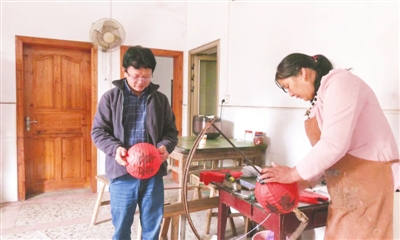 村民何斌从工厂创办之初便来到这里务工,她熟练地将裁剪好的纸张裱糊到灯笼上,不一会儿的功夫,一个红彤彤的灯笼就制作好了。