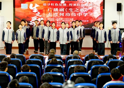 日前,广播剧《生之歌》走进何功伟中学,广播剧主创人员、咸安区朗协老师、图书馆工作人员和在校师生以分享交流、情景演绎和朗诵表演的方式,共同缅怀何功伟烈士。