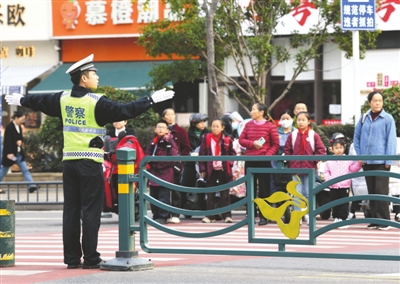 11月22日,市公安局交警支队城区大队的民警在咸宁实验外国语学校附近路口维持交通秩序。