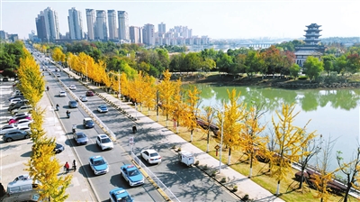 在嘉鱼沿湖大道、迎宾大道等路段,道路两旁的银杏树叶随风摇曳,满树金黄,落叶纷飞,如诗如画,吸引不少市民和游客前来观赏。