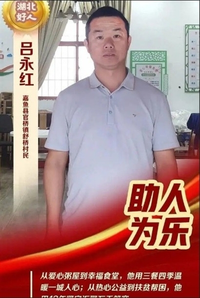 从2012年至今,吕永红一直在从事公益活动的路上。吕永红和他的爱心粥屋,也温暖着越来越多的人。去年第二季度,他获评“南鄂楷模”。