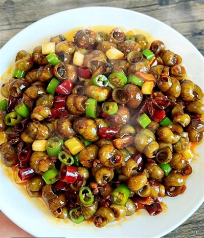 辣炒田螺是由田螺为主要食材做成的一道菜品。制作辣炒田螺要选取新鲜的田螺,新鲜的田螺即使螺肉外露,表面也会呈扭曲状态,轻轻一碰,小尖会缩回去。如果螺肉伸出螺壳,露出一个小尖,一动不动,表示螺已死去。