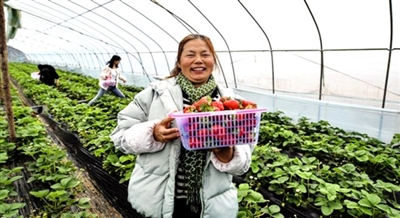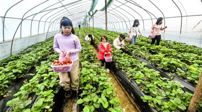 12月7日,嘉鱼县新街镇嘉多宝生态果蔬专业合作社里草莓大棚里,红彤彤的草莓吸引众多游客前来采摘。