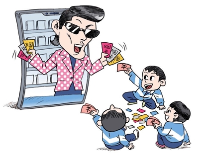 部分商家大肆兜售“烟卡”,孩子们互相攀比买“废品”。 琚理/漫画