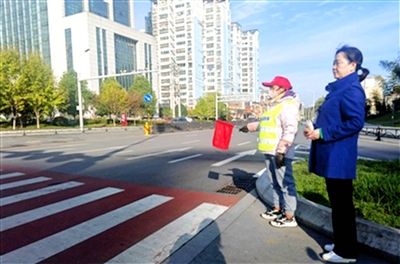 “大家注意安全……”11月27日上午9时许,在市区金桂路与银桂路交汇路口,交通劝导员盛红霞挥动小红旗,引导正在过斑马线的市民文明有序通行。
