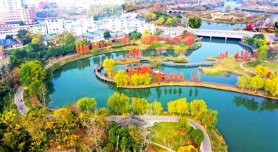 12月13日,城区龙潭湿地公园水杉红嫣、枫叶炽烈,与幽曲的栈道、碧绿的河水交相辉映,让前来散步的市民感受到怦然心动的惊喜。