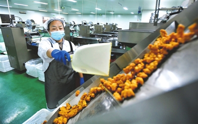 ◀12月13日,嘉鱼县新街镇申嘉食品有限公司车间,工人们正在流水线上作业。