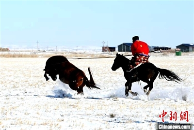 12月28日,内蒙古锡林郭勒,选手在驯马比赛中套马。当日,2024锡林郭勒冬季蒙古马超级联赛总决赛在内蒙古自治区锡林浩特市白音锡勒牧场开幕。