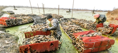 1月2日,嘉鱼县陆溪镇鸿富农产品加工股份有限公司官洲莲藕基地,挖藕机隆隆作响,运藕船来回穿梭,当天共有3万公斤莲藕装车,运往车间加工。