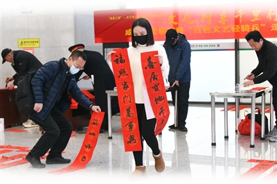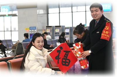 一句句祝福跃于纸上,浓浓的情意传递于字里行间。“今天我们准备了200副春联和100个‘福’字,把平安、祝福送到旅客手中。”市文联党组成员、副主席丁敬文说。