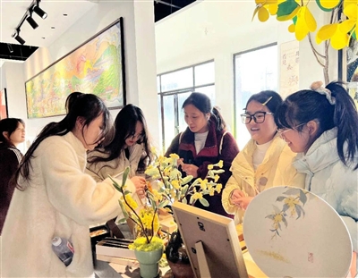 活动现场,学生们集中参观了文创空间非遗工艺馆和农产品文创馆,展馆分别展陈了咸宁工艺美术家的木雕、泥塑、竹编、非遗剪纸、扎染等工艺品,楠竹、桂花等文创产品,大家驻足观摩、积极咨询,表现出了强烈的兴趣。