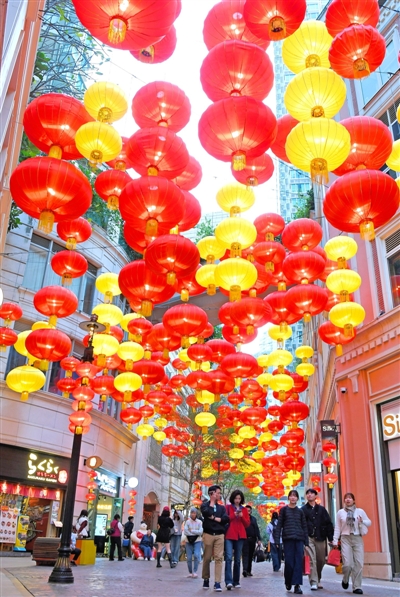 1月20日,人们在香港利东街逛街购物。 春节临近,年味渐浓,大街小巷张灯结彩,热闹的集市吸引人们前来选购年货。据新华社