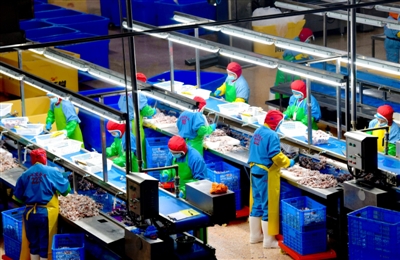 1月17日,嘉鱼县新街镇湖北浔味堂食品有限公司车间,工人们正在流水线上忙碌。该公司主要加工四大家鱼、牛蛙等食品,年产值1.8亿元,带动260余人就业。