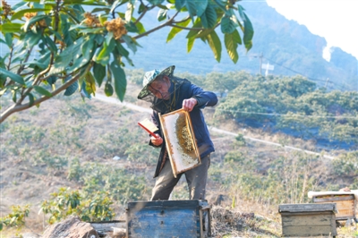 近日,通山县大畈镇万亩枇杷园内,枇杷花竞相绽放,养蜂人忙着割蜂蜡、摇蜂蜜。该镇枇杷种植面积2.4万亩,枇杷果农3200余户。每到枇杷花开时,枇杷园便吸引安徽、江西等地蜂农前来“追花”。记者 陈红菊 特约记者 吴涛 通讯员 方盈颖摄