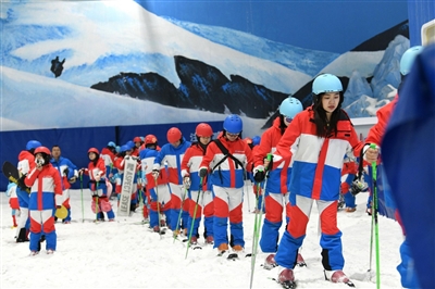 际华园香城滑雪馆里,滑雪爱好者们尽情享受着冰雪带来的乐趣,雪道上身影飞驰,欢呼声此起彼伏。孩子们在雪地里嬉戏打闹,欢笑声回荡在整个滑雪馆。