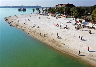 嘉鱼县蜜泉湖景区,白色的沙滩上,日光浴成为游客们的度假新选择。温暖的阳光洒在沙滩上,游客们或躺或坐,享受着悠闲时光。