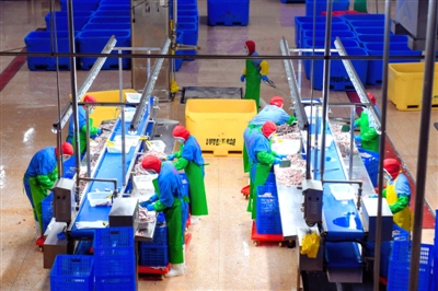 2月7日,嘉鱼县新街镇港东村湖北浔味堂食品有限公司车间,工人们正在流水线上忙碌,加紧赶制开年订单。
