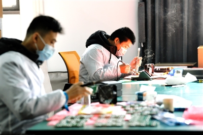 近日,咸宁(武汉)离岸科创园,武汉恒擎科技有限公司,技术员正在车间对电路板进行输入、输出焊柱焊接。