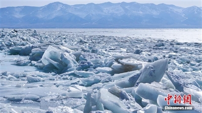近日,青海省海南藏族自治州青海湖南岸,堆积在岸边的冰块在光线照射下呈蓝冰景象,与周边雪山、蓝天、沙漠等大自然景色巧妙融合。
