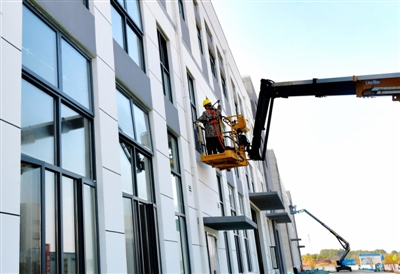 2月18日,咸安经济开发区东湖高新咸安产业园,工人们正在进行厂房外立面的装修。