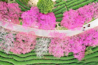 近日,位于福建漳平台湾农民创业园的永福樱花茶旅景区上万株樱花竞相绽放,茶绿樱红美不胜收。