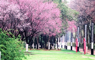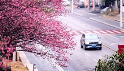 人民广场梅花沿蜿蜒小径绵延成片,粉霞般的花海与绿地相映成趣,引得不少路人驻足拍照,共品这“梅”好盛宴。