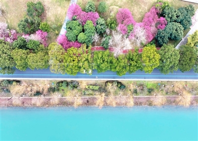 淦河畔白梅似雪、红梅灼灼,花影随碧波轻漾,绘就流动的江南画卷。