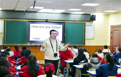 3月4日,咸安区汀泗桥镇小学,一名外教正在教室给孩子们上趣味英语课。
