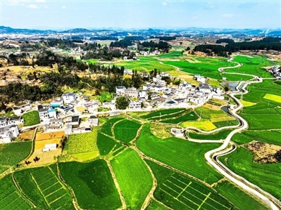 近日,在贵州省黔西市金碧镇双寨村,整洁的村庄与田野里麦苗、乡村道路相得益彰,一幅翠绿山村画卷映入眼帘。(本报综合)