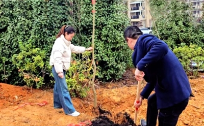 “我和我先生结婚9年了,看到社区发出活动邀请,就积极报名参加。”市民王平平正在和她先生种树,她笑着说:“种树很有纪念意义,也象征了我和他的感情,以后带着孩子来这边散步看看也会回想起今天的快乐。”