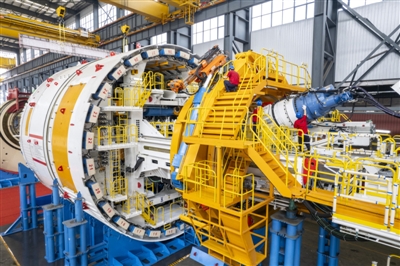 3月26日,工人在铁建重工长沙第二产业园调试“强基号”掘进机(无人机照片)。
