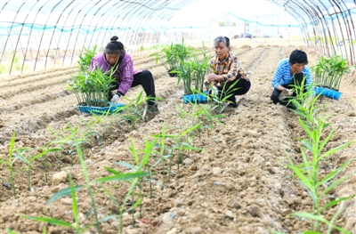 4月7日,咸安区双溪桥镇杨堡村,生姜新品种“金凤1号”高效种植示范基地,村民们将一株株嫩绿的姜苗栽进田垄间。