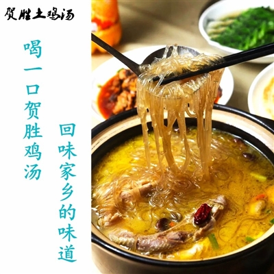 咸宁贺胜鸡汤以当地农家土鸡和无污染地下泉水小火炖制而成,汤清而味鲜醇厚,鸡肉入口即化,汤中加入本地特有的苕粉条,一来爽口弹牙,二来粉条吸收汤中的油份,吃起来便不觉得腻。尤以旅宁、和平、正宗三酒店特制的“贺胜鸡汤”最为有名。