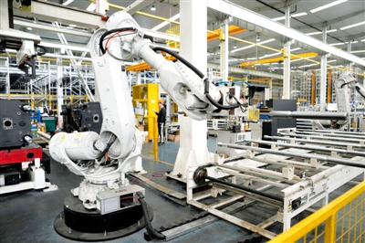 4月9日,机器人在宁波市北仑区海天国际控股有限公司大港生产基地的注塑机产品流水线上工作。