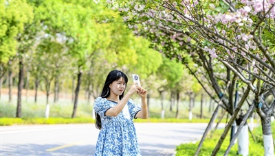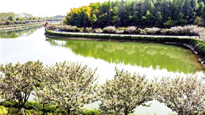 4月8日,嘉鱼县官桥镇官桥八组北湖绿道旁,樱花、白萝卜花竞相开放,美不胜收;蝴蝶飞舞其间,相映成趣。鸟瞰樱花簇拥一湾青绿湖水,近瞧各色花卉错落有致。阵阵春风拂过,花瓣飘洒湖面,令前来打卡的游客心旷神怡。