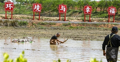 4月13日,嘉鱼县官桥镇白湖寺村五组村湾水塘里,村民正在种植野藕种。夏季,这里将呈现一片映日荷花别样红的美景。